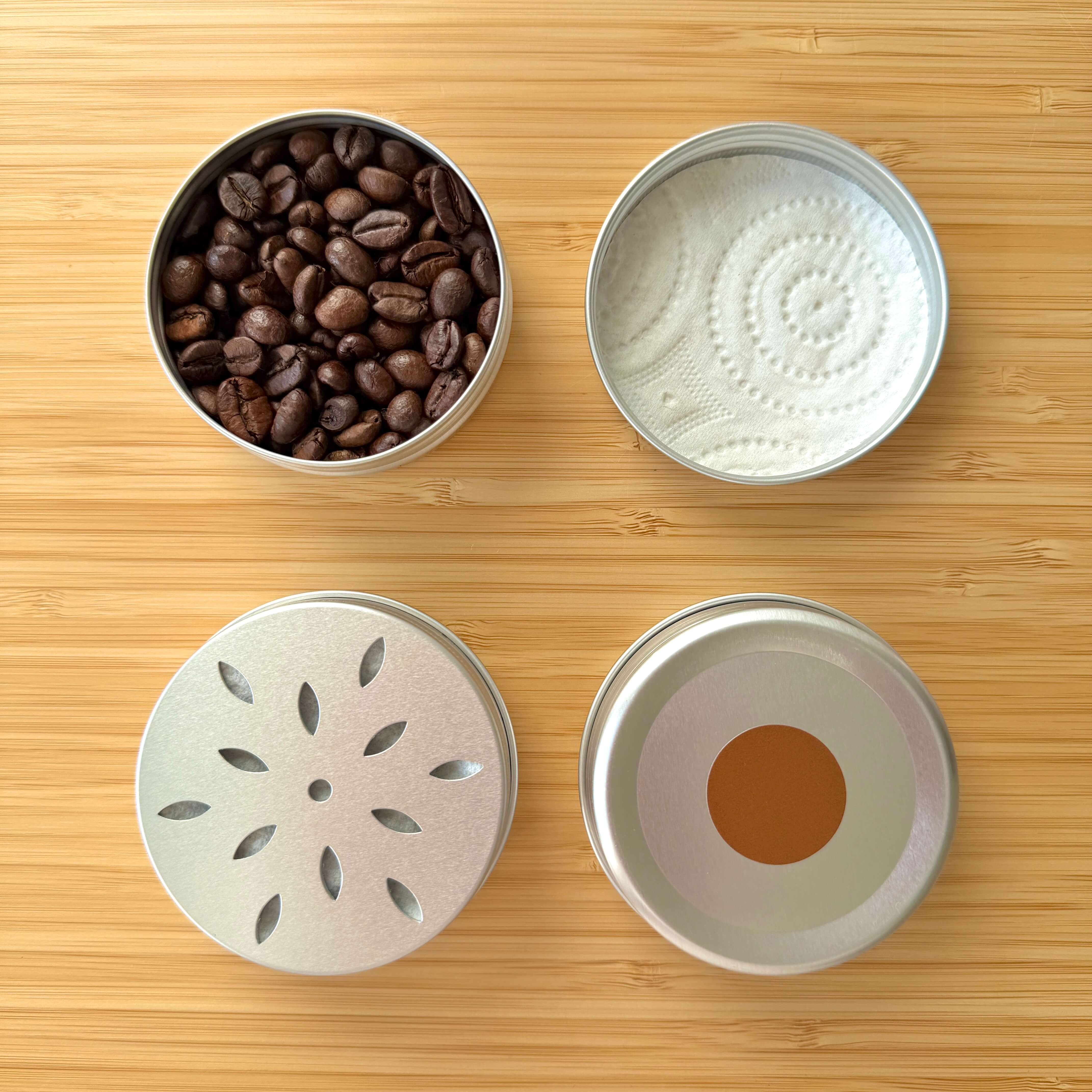 Tipp: Ich habe mir passende Kreise aus einem Küchentuch ausgeschnitten und in die Deckel gelegt. In jedem Döschen befindet sich zwar bereits eine passende Plastikabdeckung, die jedoch oft nicht genug Duft für die menschliche Nase durchlässt. Nimm diese Abdeckung daher unbedingt vorher heraus. Für die Aufbewahrung kannst du sie jedoch wieder nutzen, damit die Gerüche nicht so schnell verfliegen.